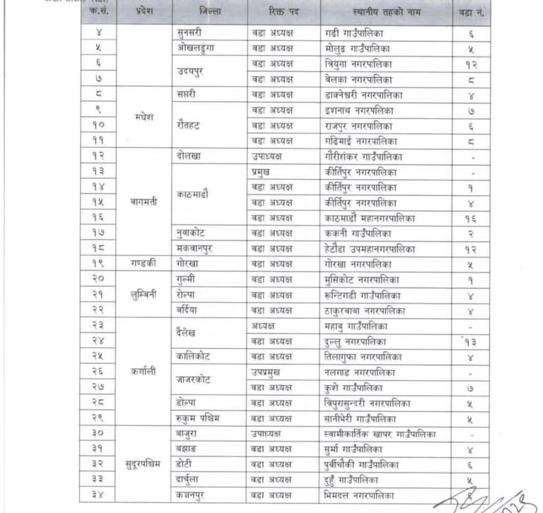 नगरपालिकाका प्रमुख–उपप्रमुख, गाउँपालिका अध्यक्ष र उपाध्यक्ष तथा वडाध्यक्ष पदमा पदपूर्ति गर्न प्रक्रिया सुरु हुनुअगावै मतदाता नामावलीमा नाम दर्ता गर्न आयोगले आह्वान गरेको हो । आयोगका अनुसार हाल देशभरका स्थानीय तहका विभिन्न पदमा ३४ पद रिक्त छन् ।