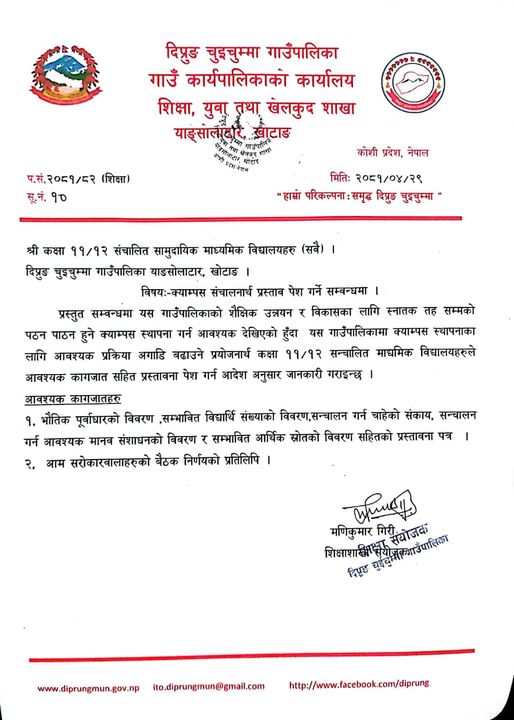 मङ्गलवार दिप्रुङ चुइचुम्मा गाउँपालिका शिक्षा शाखाले एक विज्ञप्ति जारी गर्दै स्नातक तहसम्मको शिक्षालाई प्राथमिकता दिन क्याम्पस स्थापनाका लागि क्याम्पस सञ्चालनार्थ प्रस्ताव पेस गर्न कक्षा ११\१२ सञ्चालित सामुदायिक माध्यमिक सबै विद्यालयहरूलाई आह्वान गरेको छ । भौतिक पूर्वाधारको विवरण सम्भावित विद्यार्थी सङ्ख्याको विवरण, सञ्चालन गर्न चाहेको सङ्काय, सञ्चालन गर्न आवश्यक मानव संसाधनको विवरण र सम्भावित आर्थिक स्रोतको विवरण सहितको प्रस्तावना पत्र , आम सरोकारवालाहरूको बैठक निर्णयको प्रतिलिपिसहित क्याम्पस सञ्चालनार्थ प्रस्ताव पेस गर्न गाउँपालिकाले आग्रह गरेको हो ।