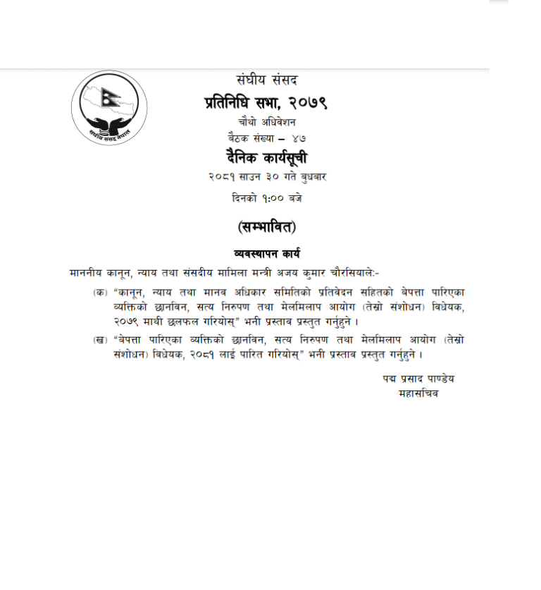 यस्तै बैठकमा ‘बेपत्ता पारिएका व्यक्तिको छानबिन, सत्य निरूपण तथा मेलमिलाप आयोग (तेस्रो संशोधन) विधेयक, २०८१’ पारित गर्न प्रस्ताव गर्ने सम्भावित कार्यसूचीमा उल्लेख छ ।