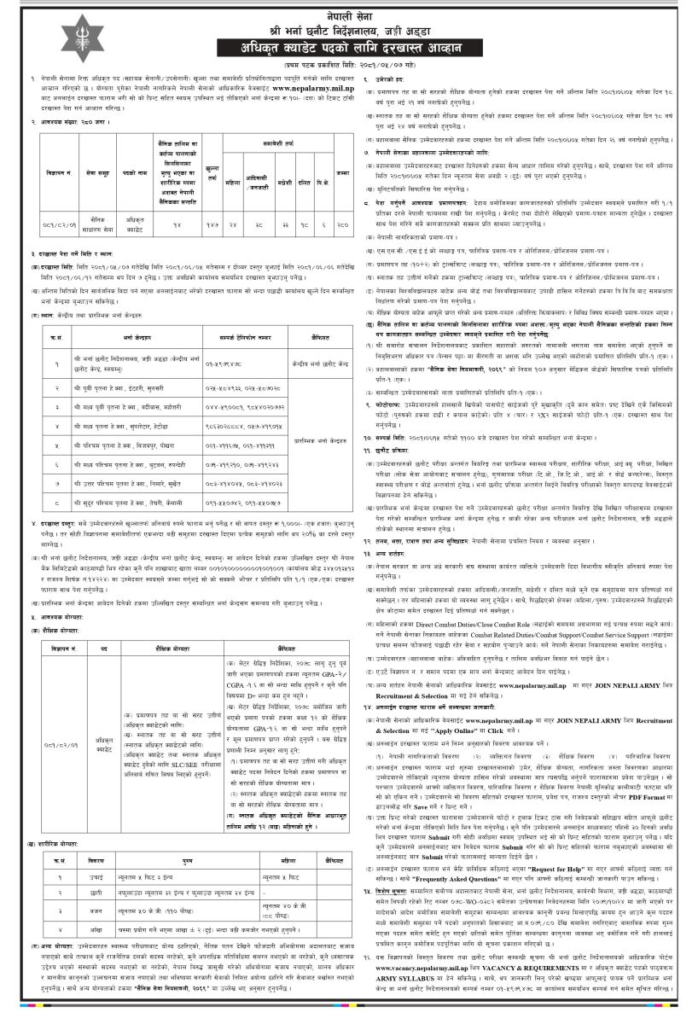 काठमाडौं । नेपाली सेनाले अधिकृत क्याडेट पदतर्फ २८० जनाका लागि आवेदन माग गरेको छ । आज (शुक्रबार) एक सूचना जारी गर्दै नेपाली सेनाले रिक्त अधिकृत पदतर्फ (सहायक सेनानी-उपसेनानी) खुल्ला तथा समावेशी प्रतियोगिताद्वारा पदपूर्तिका लागि दरखास्त आह्वान गरेको हो ।