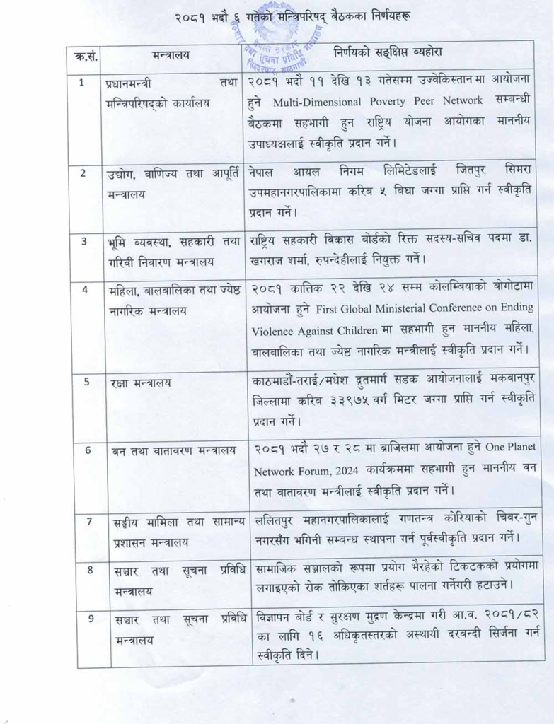 मन्त्रिपरिषद्का निर्णयहरू: