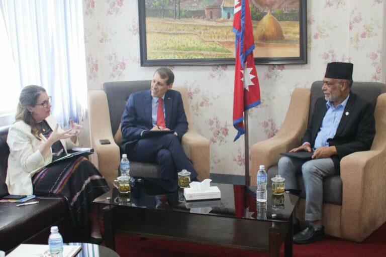 काठमाडौं ।कृषि तथा पशुपन्छी विकास मन्त्री रामनाथ अधिकारीसँग अमेरिकी दूतावासका डेपुटी चिफ अफ मिसन ज्यासोन मिक्स र युएसएआइडीका मिसन डाइरेक्टर मिस कटिई डोनोहोबीच शिष्टाचार भेट गरेका छन् । कृषि मन्त्रालयमा बिहीबार भएको भेटमा दुई देश ९नेपाल र संयुक्त राज्य अमेरिका०बिचको आपसी सद्भाव, समझदारी, सहयोगका साथै विविध विषयमा छलफल भएको हो ।