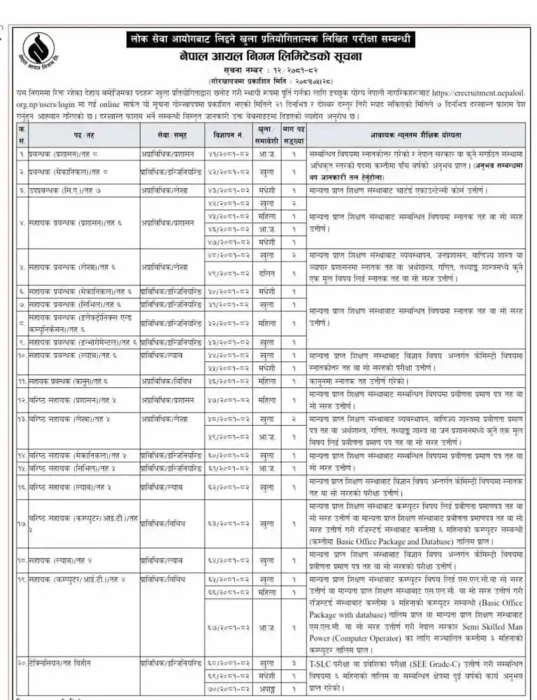 काठमाडौँ । नेपाल आयल निगम लिमिटेडले विभिन्न पदमा ३५जना नयाँ कर्मचारीका लागि आवेदन माग गरेको छ ।