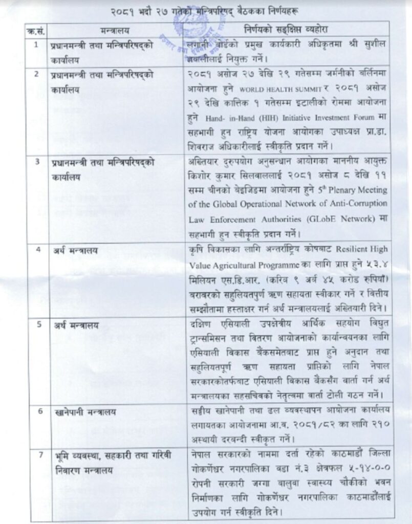 काठमाडौँ । विहिबार बसेको मन्त्रिपरिषद्को बैठकका निर्णयहरु सार्बजनिक भएका छन् ।