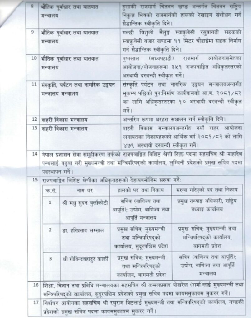 बैठकले सुशील ज्ञवालीलाई लगानी बोर्डको प्रमुख कार्यकारी अधिकृतमा नियुक्त गर्ने निर्णय गरको छ भने मन्त्रिपरिषद्को बैठकले अन्तरिम रुपमा धरहरा संचालनको अनुमति दिने निर्णय गरेको छ ।