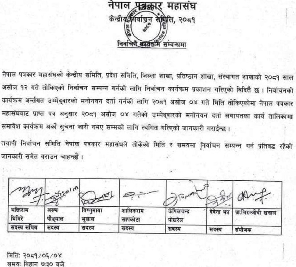 समितिले एक सूचना जारी गर्दै भनेको छ- ‘नेपाल पत्रकार महासङ्घको केन्द्रीय समिति, प्रदेश समिति, जिल्ला शाखा, प्रतिष्ठान शाखा, संस्थागत शाखाको २०८१ साल असोज १२ गते तोकिएको निर्वाचन सम्पन्न गर्नको लागि निर्वाचन कार्यक्रम प्रकाशन गरिएको विदितै छ ।निर्वाचनको कार्यक्रम अन्तरगत उम्मेदवारको मनोनयन दर्ता गर्नको लागि २०८१ असोज ०४ गते मिति तोकिएकोमा नेपाल पत्रकार महासङ्घबाट प्राप्त पत्र अनुसार २०८१ असोज ०४ गतेको उम्मेदवारको मनोनयन दर्ता लगायतका कार्य तालिकामा समावेश कार्यक्रम अर्को सूचना जारी नभए सम्मको लागि स्थगित गरिएको जानकारी गराइन्छ ।’