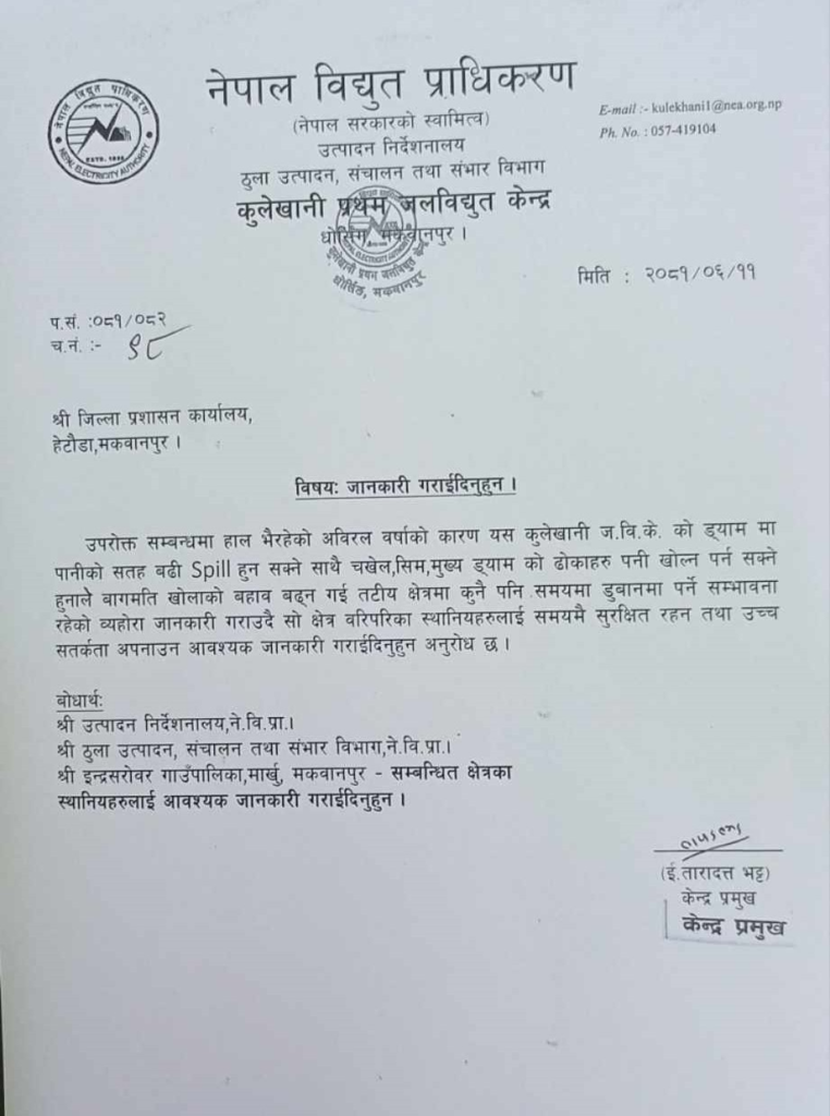 कुलेखानी प्रथम जलविद्युत् केन्द्र, मकवानपुरका प्रमुख तारादत्त भट्टले सूचना जारी गर्दै यस्तो आग्रह गर्नुभएको हो ।