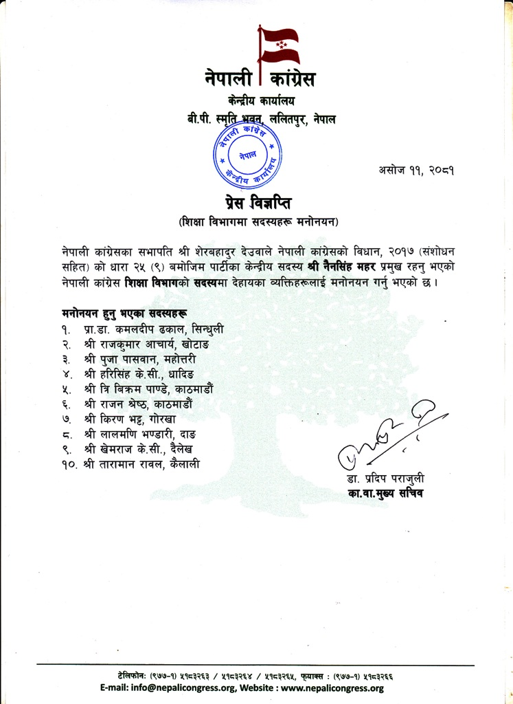 कांग्रेसको विधान, २०१७ (संशोधन सहित) को धारा २५ (९) बमोजिम सदस्य मनोनयन गरेको कार्यवाहक मुख्यसचिव प्रदिप पराजुलीले बताए ।