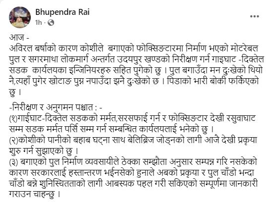 मन्त्री राईले बगाएको पुल निर्माण व्यवसायीले ठेक्का सम्झौता अनुसार सम्पन्न गरि नसकेको कारण सरकारलाई हस्तान्तरण भईनसेको हुनाले अबको प्रकृया र पुल चाँडो भन्दा चाँडो बन्ने शुनिस्चितताको लागी आबस्यक पहल गरी सकिएको समेत जानकारी गराएका छन् ।