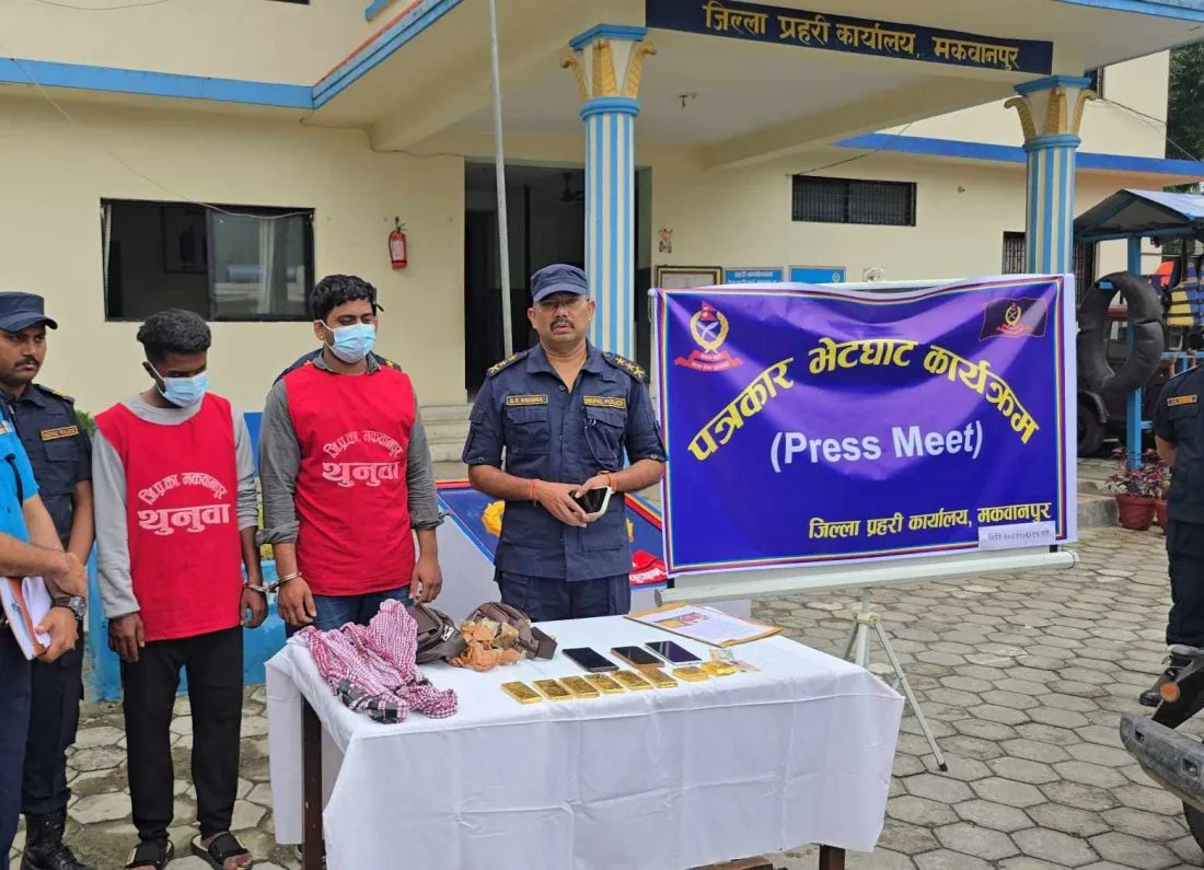 प्रहरीका अनुसार आज बिहान ३ बजेको समयमा पथलैयाबाट हेटौँडातर्फ आउँदै गरेको बागमती प्रदेश ०२–०४७ प ७५०३ नम्बरको स्कुटरलाई रोकी जाँच गर्ने क्रममा स्कुटर चालक अभिषेक र स्कुटरमा सवार राहुलको साथबाट आठ वटा बिस्कुटको आकारको (तौल गर्दा आठ किलो २४३ ग्राम ९७० मिलिग्राम) सुन बरामद भएपछि निजहरुलाई पक्राउ गरिएको हो ।