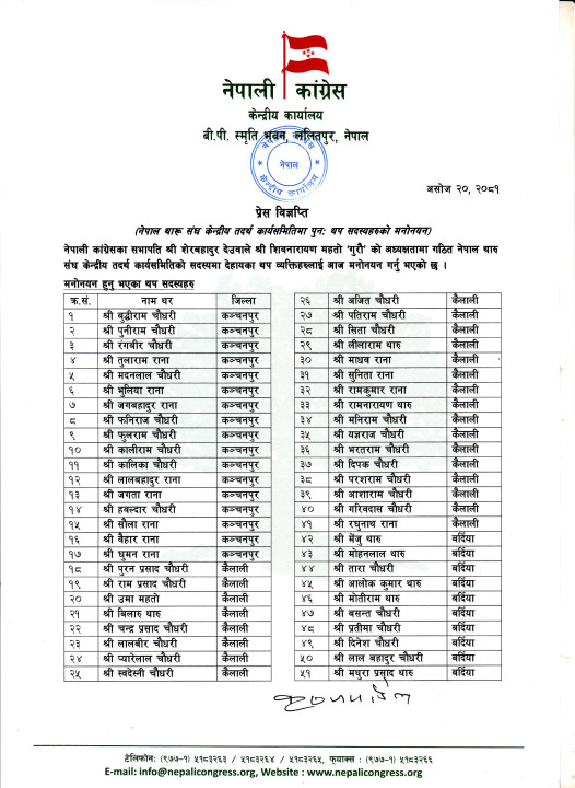 देउवाले केन्द्रीय तदर्थ कार्यसमितिको सदस्यमा देहायका व्यक्तिहरुलाई आइतबार मनोनयन गरेका हुन् ।