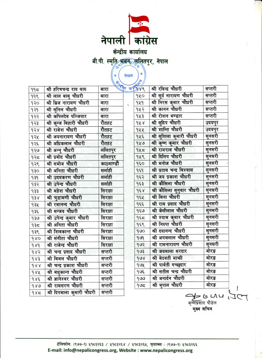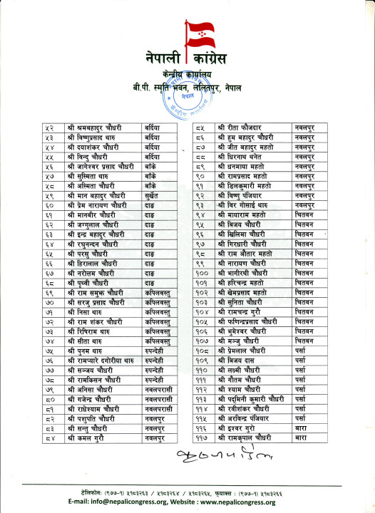 काठमाडौं । सत्तारुढ दल नेपाली कांग्रेसको थारु संघको केन्द्रीय कार्यसमितिमा १७८ जना मनोनीत भएका छन् । सभापति शेरबहादुर देउवाले शिवनारायण महतो ‘गुरौ’ को अध्यक्षतामा नेपाल थारु संघ केन्द्रीय तदर्थ कार्यसमितिमा १७८ सदस्यहरु मनोनयन गरेका छन् ।