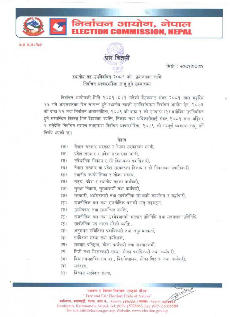 ‘निर्वाचन आचारसंहिता सम्पूर्ण व्यक्ति, संस्था तथा अधिकारीको कानुनी दायित्व एवम् नैतिक बन्धन भएकाले यसको सम्पूर्ण रुपले पालना गरी निर्वाचनलाई स्वच्छ, स्वतन्त्र, निष्पक्ष र विश्वसनीय रुपमा सम्पन्न गर्ने कार्यमा सबैको सहयोग हुनेमा आयोग विश्वस्त छ’, प्रवक्ता पोखरेलले भने ।