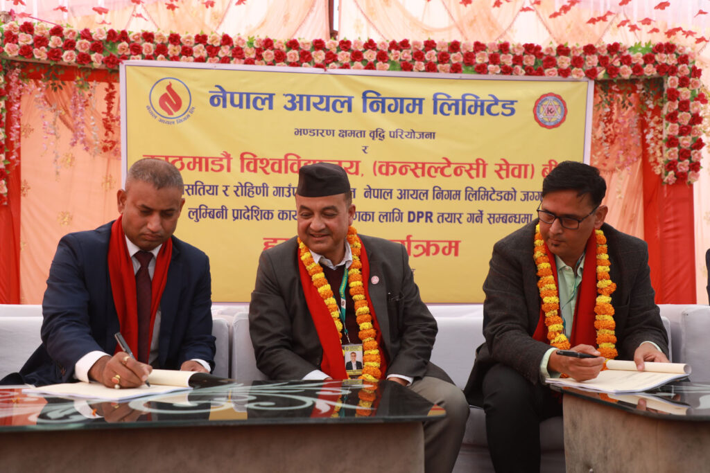 भैरहव। रुपन्देहीको ओमसतिया र रोहिणी गाउँपालिकामा नेपाल आयल निगमका लुम्बिनी प्रदेशिक भण्डारण गृह निर्माणका लागि विस्तृत परियोजना प्रतिवेदन (डिपिआर) तयार गर्न काठमाडौँ विश्वविद्यालयसँग सम्झौता भएको छ । आज यहाँ आयोजित कार्यक्रममा भण्डारण क्षमता वृद्धि परियोजनाका प्रमुख एवं निगमका उपनिर्देशक प्रदीप यादव र काठमाडौँ विश्वविद्यालय (कन्सल्टेन्सी विभाग)का प्रमुख विवेक बरालले उक्त सम्झौतापत्रमा हस्ताक्षर गरे।