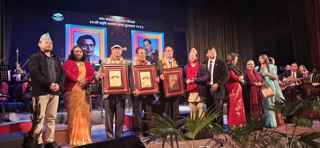 स्वरसम्राटको ३४औँ स्मृति दिवसको अवसरमा नारायणगोपाल संगीत कोषले बुधबार गायक कुमार बस्नेत, संगीतकार बुलु मुकारुङ र कवि तथा गीत रचनाकार शिवशंकर थापालाई नारायण गोपाल स्मृति सम्मान २०८१’ प्रदान गरिएको हो ।