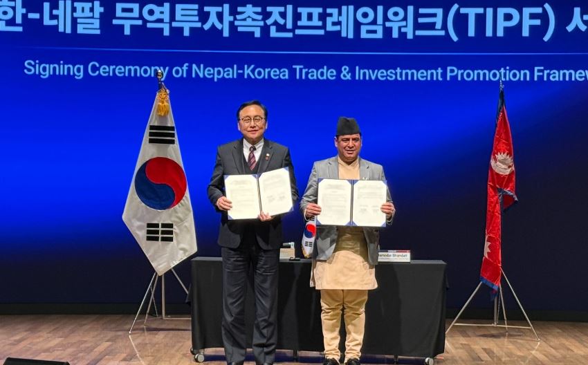 काठमाडौं । उद्योग, वाणिज्य तथा आपूर्ति मन्त्री दामोदर भण्डारी र दक्षिण कोरियाका समकक्षी इन्क्यो च्योङ बीच द्विपक्षीय व्यापार तथा लगानी प्रवर्द्धन फ्रेमवर्क (टि.आइ.पी.एफ.) सम्झौतामा हस्ताक्षर भएको छ । गणतन्त्र दक्षिण कोरिया र नेपालको द्विपक्षीय सम्बन्ध स्थापित भएको ५० वर्ष पूरा भएका अवसरमा आज(बिहीबार) दक्षिण कोरियाको राजधानी सोलमा उक्त सम्झौतामा हस्ताक्षर गरिएको हो ।