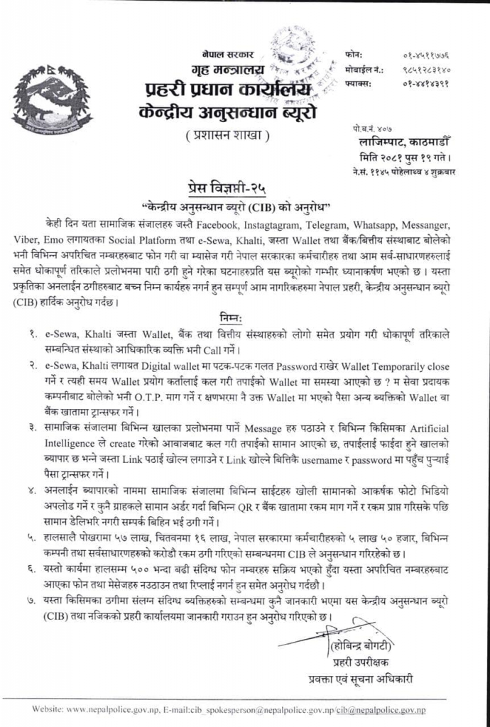 केन्द्रीय अनुसन्धान ब्यूरो (सीआईबी)ले पछिल्लो समय विभिन्न सामाजिक सञ्जाल फेसबुक, इन्टाग्राम, टेलिग्राम, ह्वाट्सएप, मेसेन्जर, भाइबर, इमोलगायत प्लेटफर्मबाट बोलेको भन्दै अपरिचित नम्बरबाट मेसेज वा कल गरी ठगी गर्ने कार्य बढेकाले ब्यूरोले सर्वसाधारणलाई सचेत गराएको हो ।