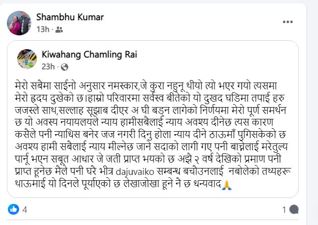 यस्तै सोही वडामा जन्मिएका हाल युके प्रहरीमा निकै माथिल्लो दर्जामा कार्यरत किवाहङ राईले सामाजिक संजालमा एक सन्देश टेक्स गर्दै सो विषय रहस्यमय भएको उल्लेख गरेका छन् । उनले त्यो मात्र लेखेका छैनन् ,सो विषय अनुसन्धानका लागि सम्बन्धित निकायसम्म पठाइएको समेत उल्लेख गरेका छन् । उनले आफू टाढा भएपनि समाजमा घट्ने विभिन्न किसिमका अपराध नघटुन् र पीडितले न्याय पाउन् भन्ने चाहान्छन् ।