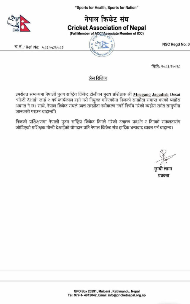 काठमाडौं । नेपाल क्रिकेट एसोसियसन क्यानले नेपाली राष्ट्रिय टीमका मुख्य प्रशिक्षक मोन्टी देसाईलाई बिदाई गरेको छ ।