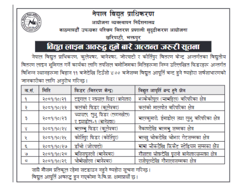 प्राधिकरणको कुलेश्वर, बानेश्वर, जोरपाटी र कीर्तिपुर वितरण केन्द्र अन्तरगतका विद्युतीय वितरण लाइन भूमिगत गर्ने कार्यका लागि ८ दिनसम्म विभिन्न फिडर अन्तरगतका स्थानहरूमा बिहान ११ बजेदेखि दिउँसो ४ बजेसम्म विद्युत् आपूर्ति बन्द हुन लागेको हो ।