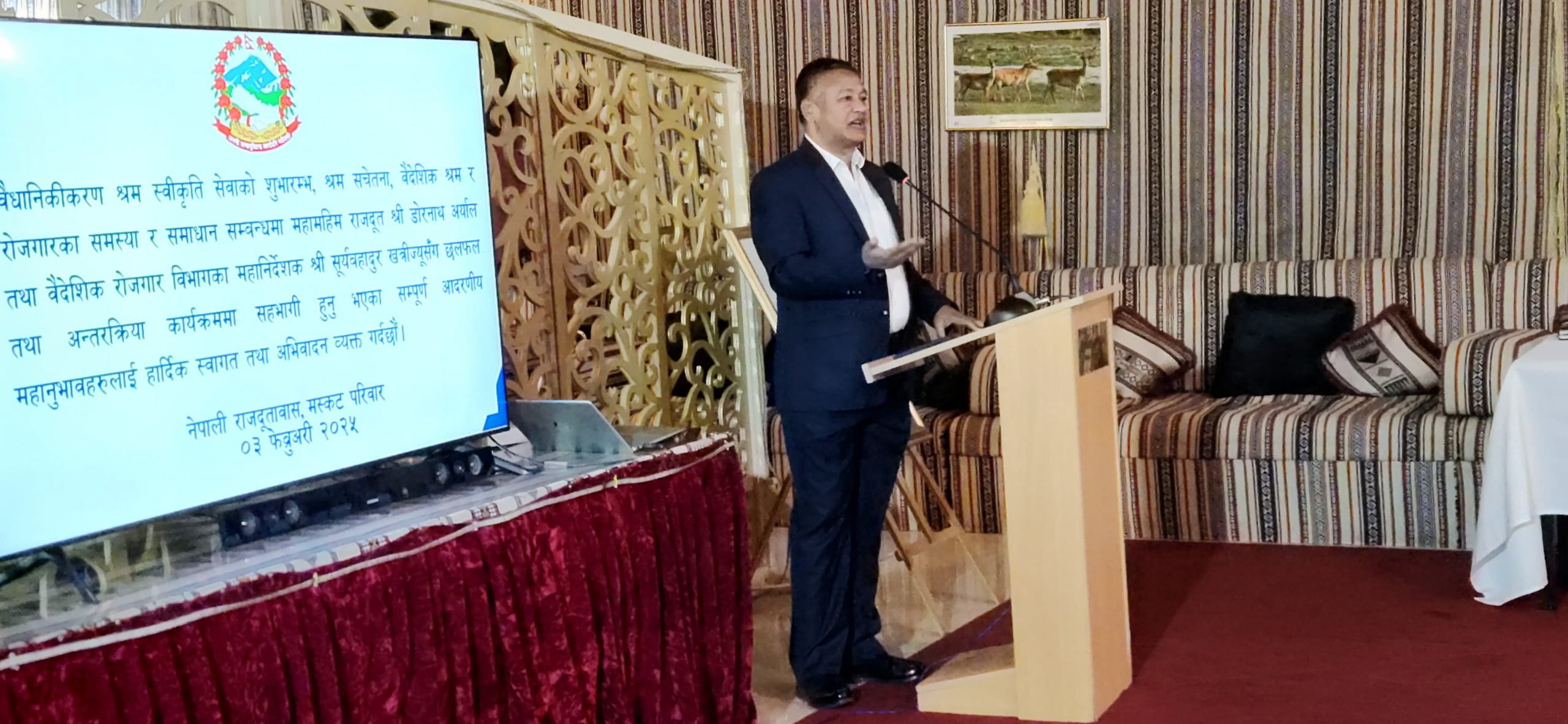 विभिन्न माध्यमबाट ओमान पुगेका तर श्रम स्वीकृति नभएका नेपालीलाईराजदूत डोरनाथ अर्याल र वैदेशिक रोजगार विभागका महानिर्देशक सूर्यबहादुर खत्रीले संयुक्त रुपमा श्रम स्वीकृति प्रदान गरेका हुन् ।