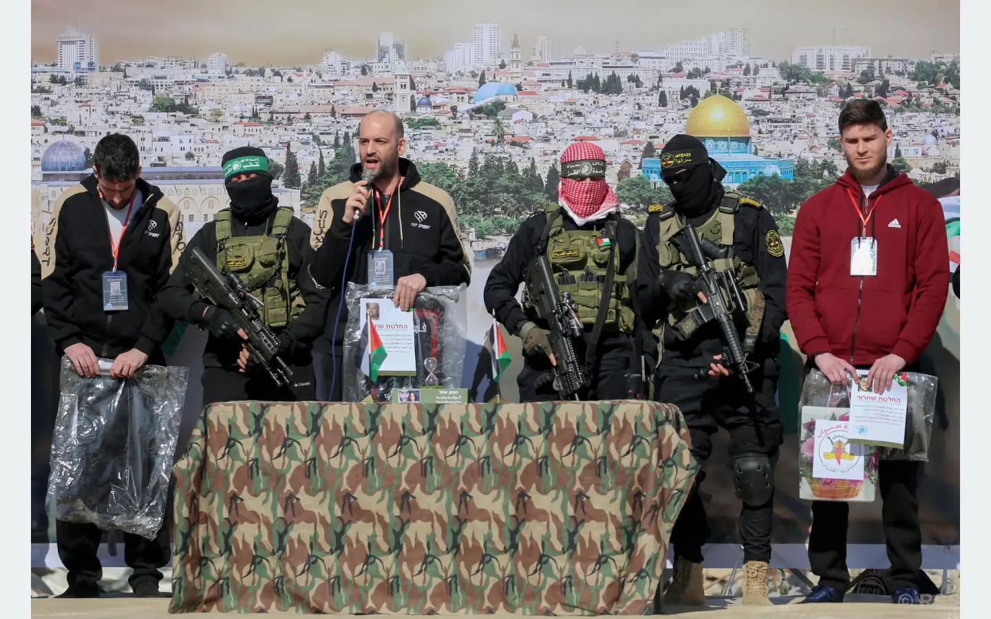 हमासका नकाबधारी लडाकूहरूले गाजाको दक्षिणी शहर खान युनिसको एक मञ्चमा बन्धकहरूलाई परेड गराएपछि उनीहरूलाई रेडक्रसलाई हस्तान्तरण गर्नुअघि भीडलाई सम्बोधन गर्न भनिएको थियो।