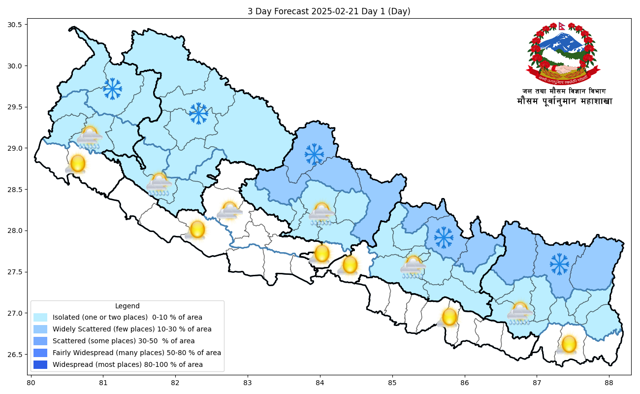 आगामी २४ घण्टामा सुदूरपश्चिम, कर्णाली, गण्डकी र कोशी प्रदेशका पहाडी भागका एक–दुई स्थानमा हल्का वर्षाको सम्भावना छ । कोशी , बागमती र गण्डकी प्रदेशका उच्च पहाडी तथा हिमाली भागका केही स्थान तथा बाँकी प्रदेशका उच्च पहाडी र हिमाली भेगका एक–दुई स्थानमा हल्का हिमपातको सम्भावना रहेको जनाउँदै महाशाखाले त्यसबाट दैनिक जनजीवन, स्वास्थ्य, सडक तथा हवाईउड्डयनमा आंशिक प्रभाव पर्न सक्ने भएकाले सम्बद्ध सबैलाई सतर्कता अपनाउन अनुरोध गरेको छ ।