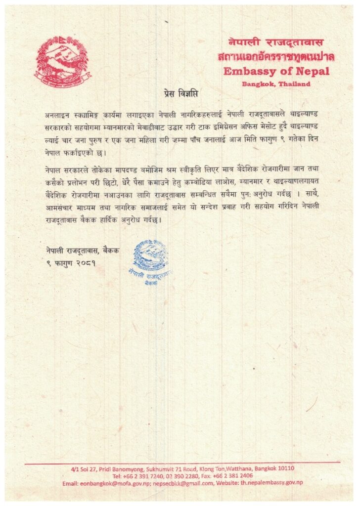 बैंककस्थित नेपाली दूतावासले नेपाल सरकारले तोकेका मापदण्डबमोजिम श्रम स्वीकृति लिएर मात्र वैदेशिक रोजगारीमा जान अनुरोध गरेको छ । ‘कसैको प्रलोभनमा परी छिटो, धेरै पैसा कमाउने हेतुले कम्वोडिया लाओस, म्यानमार र थाइल्याण्डलगायत वैदेशिक रोजगारीमा नआउनका लागि राजदूतावास सम्बन्धित सबैमा पुनः अनुरोध गर्दछ,’ विज्ञप्तिमार्फत दूतावासले भनेको छ ।