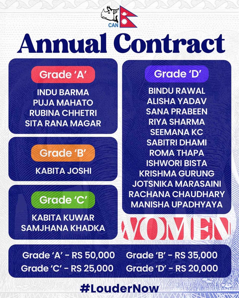 काठमाडौं । नेपाल क्रिकेट संघ (क्यान) ले १९ महिला क्रिकेट खेलाडीलाई दिएको बार्षिक सम्झौताको सूची सार्बजनिक गरेको छ ।