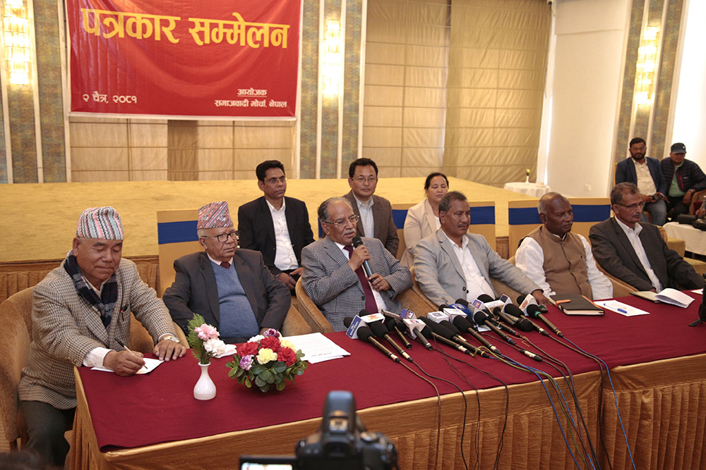 समाजवादी मोर्चाले शनिबार देशमा विकसित नयाँ परिस्थिति र प्रतिगामी तत्वहरुको क्रियाकलापबारे समाजवादी मोर्चाले आफ्नो दृष्टिकोण सार्बजनिक गर्दै राज्य संचालकको स्वेच्छाचारिताका कारण देशले अप्ठ्यारो र सङ्कटपूर्ण अवस्थाको सामना गरिरहेको बताएको हो ।
