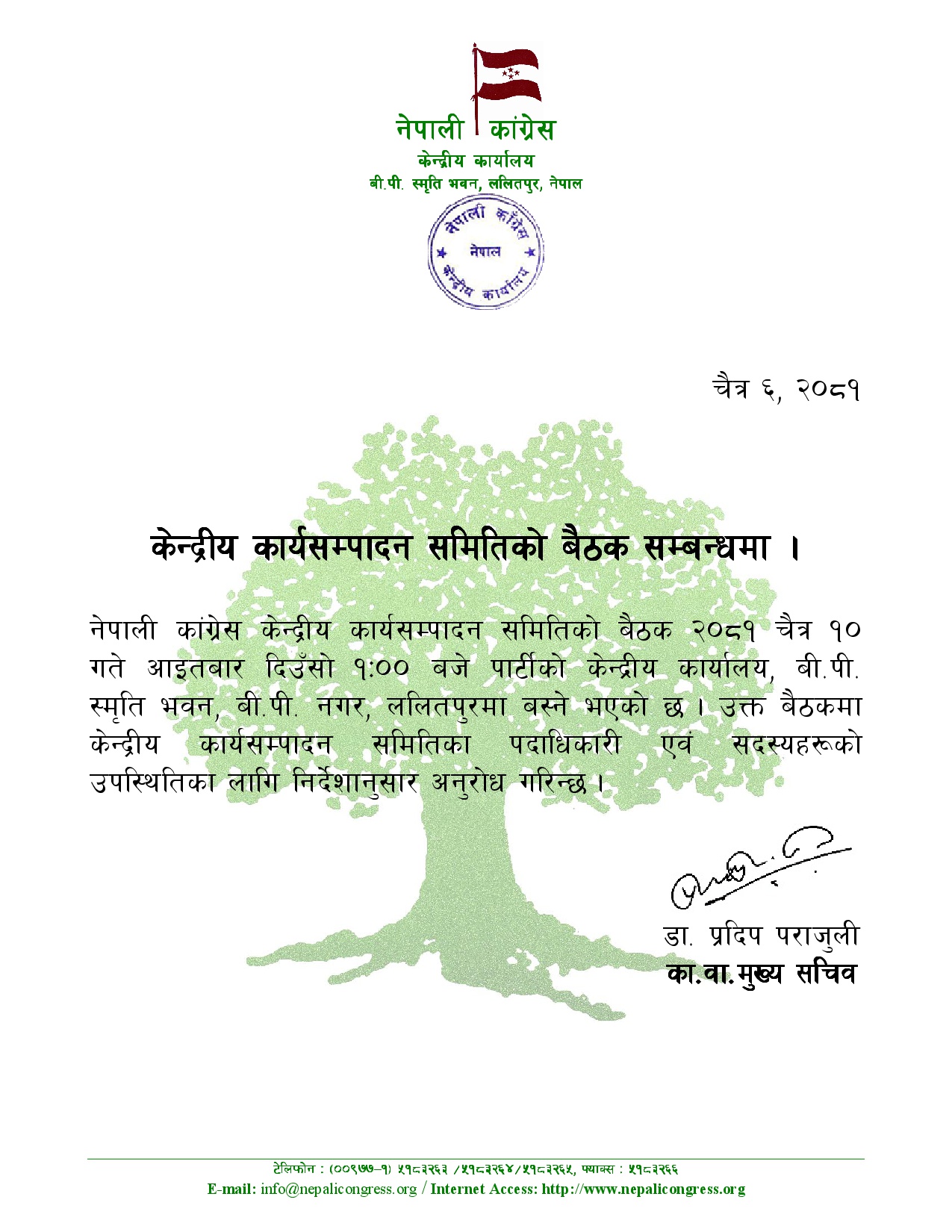 काठमाडौं । सत्ता साझेदार नेपाली कांग्रेसले केन्द्रीय कार्यसम्पादन समितिको बैठक बोलाएको छ। बैठक चैत १० गते आइतबार दिउँसो १ बजे सानेपास्थित केन्द्रीय कार्यालयमा बस्ने छ । बैठकमा केन्द्रीय कार्यसम्पादन समितिका पदाधिकारी एवं सदस्यहरूको उपस्थिति अनिवार्य गरिएको छ ।