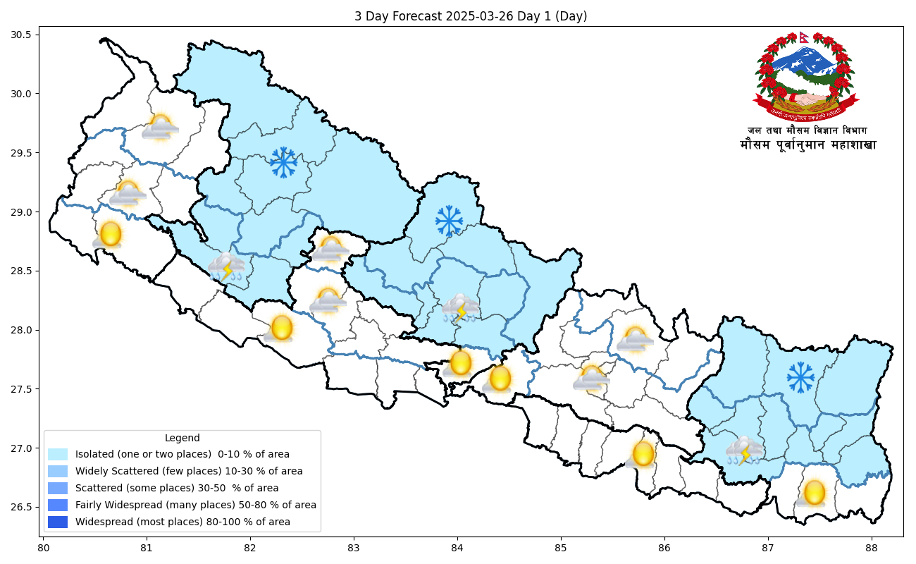 आगामी २४ घण्टामा कोशी, गण्डकी र कर्णाली प्रदेशका पहाडी भागका एक–दुई स्थानमा मेघगर्जन र चट्याङसहित हल्का वर्षाका साथै उच्च पहाडी तथा हिमाली भागका एक–दुई स्थानमा हल्का हिमपातको सम्भावना रहेको जनाउँदै महाशाखाले त्यसबाट दैनिक जनजीवन, कृषि, स्वास्थ्य, सडक तथा हवाईउड्डयनमा आंशिक प्रभाव पर्न सक्ने हुँदा सतर्कता अपनाउन विभागले सम्बद्ध सबैमा अनुरोध गरेको छ ।