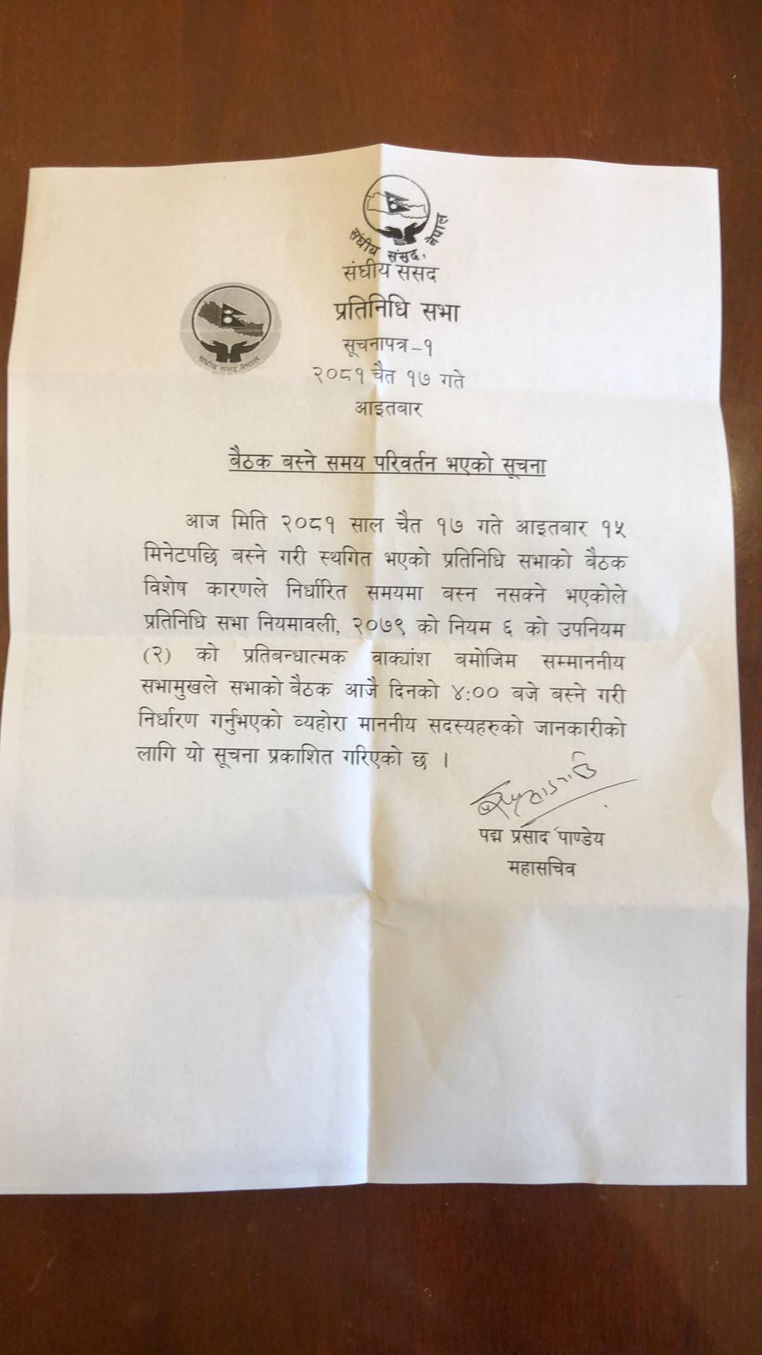 बैठक सुचारू हुन नसकेपछि सूचना टाँसेर ४ बजेसम्मका लागि स्थगित गरिएको हो।