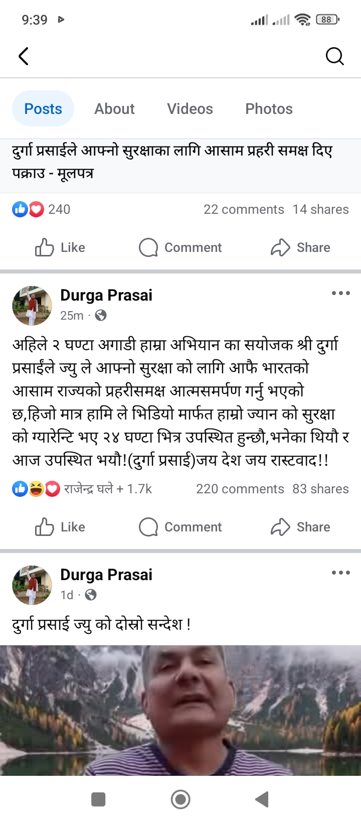 ९:१३ मा हालिएको फेसबुक स्टाटसमा लेखिएको छ, ‘अहिले २ घण्टा अगाडि हाम्रा अभियानका संयोजक श्री दुर्गा प्रसाईंज्यूले आफ्नो सुरक्षा को लागि आफैँ भारतको आसाम राज्यको प्रहरीसमक्ष आत्मसमर्पण गर्नुभएको छ, हिजोमात्र हामी ले भिडिओ मार्फत हाम्रो ज्यानको सुरक्षा को ग्यारेन्टी भए २४ घण्टाभित्र उपस्थित हुन्छौं,भनेका थियौं र आज उपस्थित भयौं !(दुर्गा प्रसाईँ) जय देश जय रास्टवाद!!’
