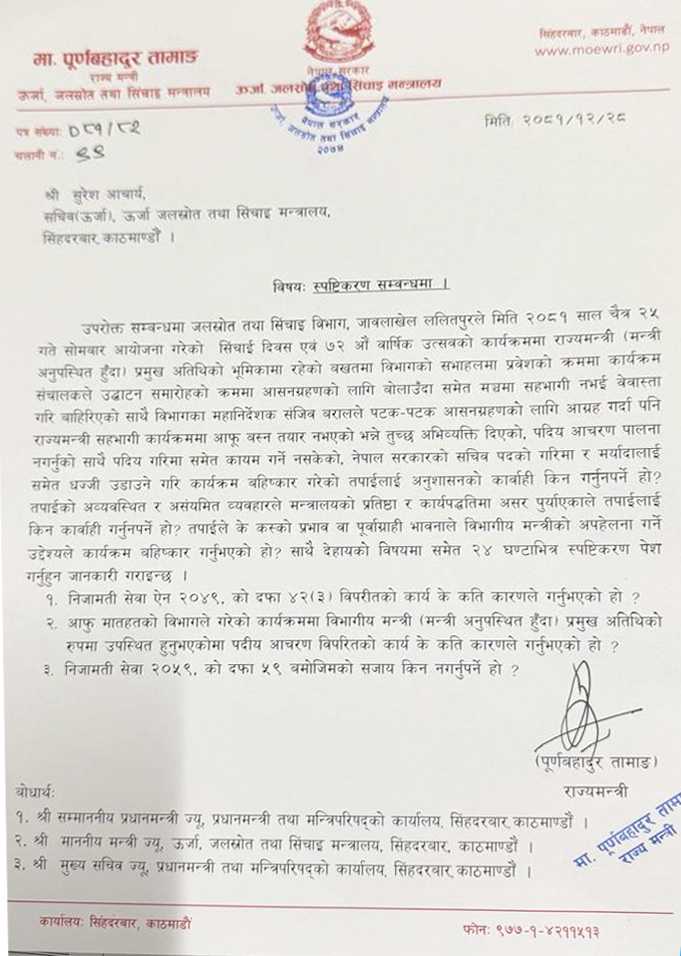 काठमाडौं।ऊर्जा, जलस्रोत तथा सिँचाइ मन्त्रालयका राज्यमन्त्री पूर्णबहादुर तामाङले मन्त्रालयका सचिव सुरेश आचार्यलाई २४ घण्टे स्पष्टीकरण सोधेका छन्। राज्यमन्त्री तामाङले सचिव आचार्यले पदीय आचरणअनुसार व्यवहार नगरेको गम्भीर आरोप लगाउँदै तत्काल जवाफ माग गरेका हुन्।
