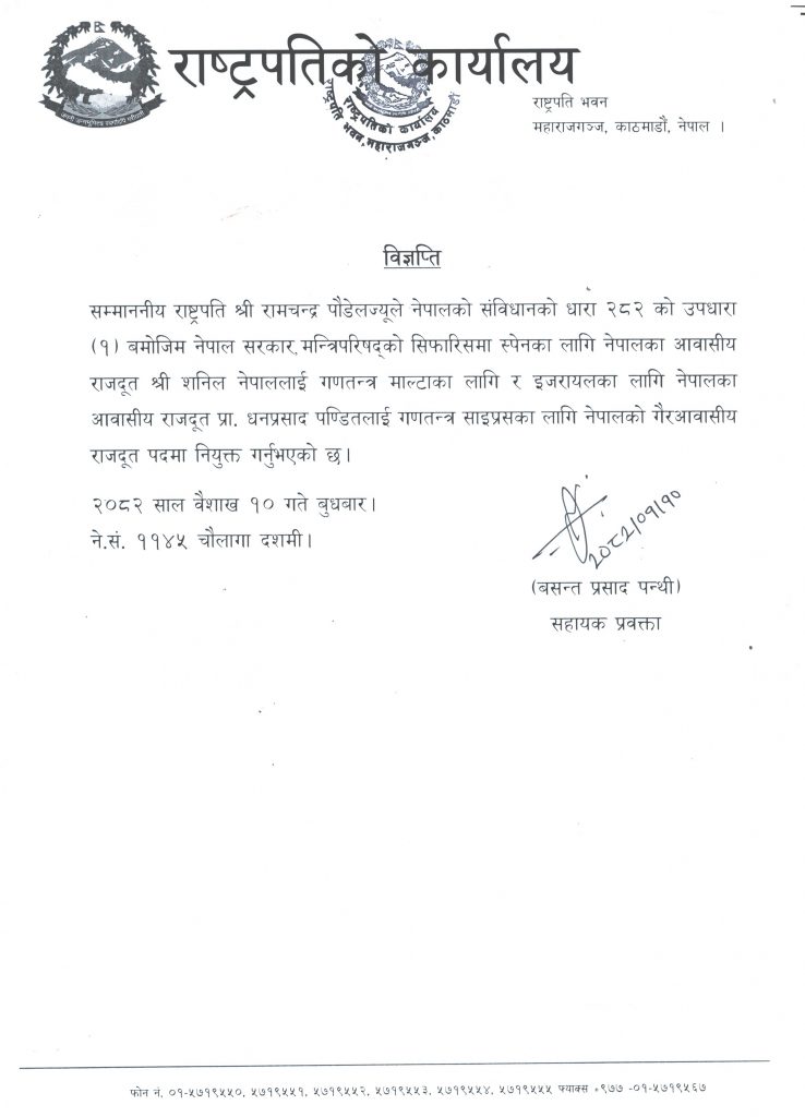 राष्ट्रपतिको कार्यालयद्वारा आज जारी विज्ञप्तिअनुसार शनिल नेपाललाई गणतन्त्र माल्टाका लागि नेपाल सरकारको गैर आवासीय राजदूत पदमा नियुक्त गरिएको छ। त्यस्तै, प्रा. डा. धनप्रसाद पण्डितलाई गणतन्त्र साइप्रसका लागि नेपाल सरकारको गैरआवासीय राजदूत पदमा नियुक्त गरिएको जनाइएको छ।