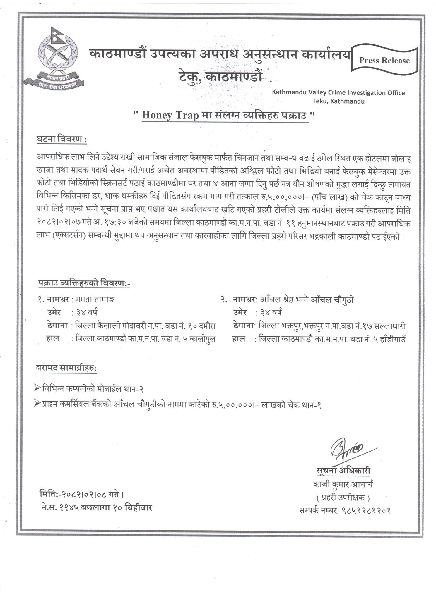 काठमाडौं । सामाजिक सञ्जालको माध्यमबाट परिचय गराई एक युवकलाई हनी ट्र्यापमा पारेर ब्ल्याकमेल गरेको आरोपमा प्रहरीले दुई युवतीलाई पक्राउ गरेको छ। ती युवतीहरूले युवकलाई नग्न भिडियो र बलात्कार मुद्दाको डर देखाएर पाँच लाख रुपैयाँ असुलेको खुलेको छ।