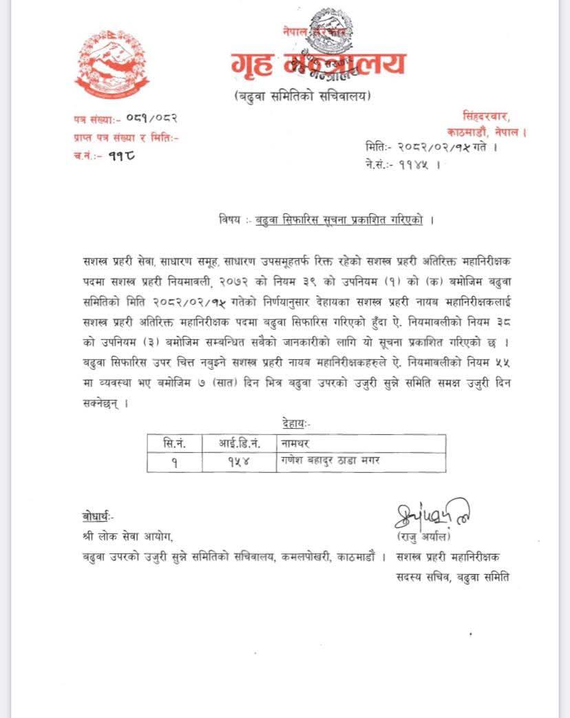 बिहीबार गृह मन्त्रालयका सचिव गोकर्णमणी दुवाडीको नेतृत्वमा बसेको बढुवा समितिले उनलाई एआईजीमा बढुवा सिफारिस गरेको हो।