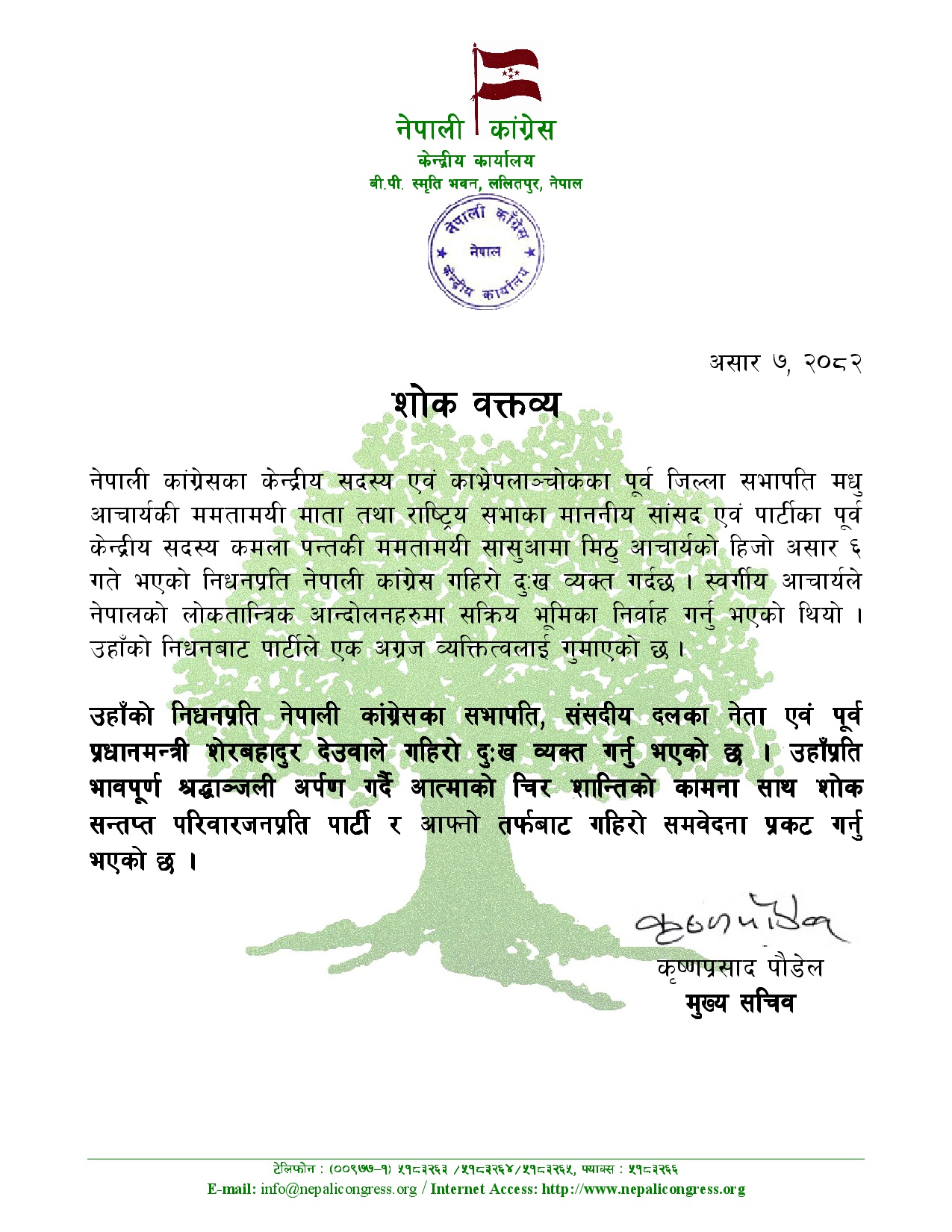सभापति देउवाले आज शोक विज्ञप्तिमार्फत उनको निधनप्रति दुःख व्यक्त गर्दै शोक सन्तप्त परिवारजनमा समवेदना प्रकट गरेका छन् । देशको लोकतान्त्रिक आन्दोलनहरूमा सक्रिय भूमिका निर्वाह गरेकी आचार्यको निधनबाट पार्टीलाई अपूरणीय क्षति भएको बताएका छन् ।