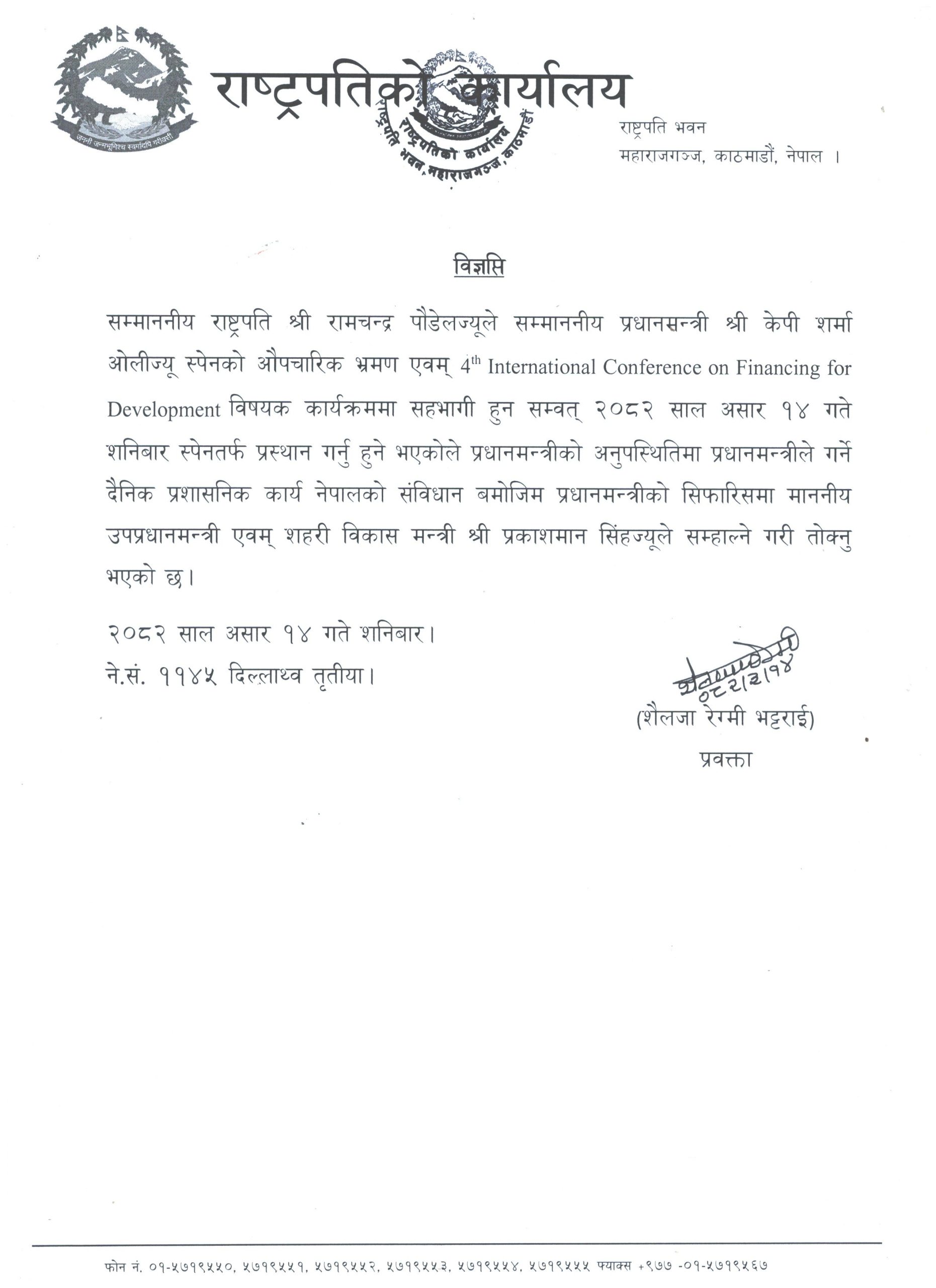 राष्ट्रपति कार्यालयकी प्रवक्ता शैलजा रेग्मी भट्टराईले एक विज्ञप्ति जारी गर्दै राष्ट्रपतिले नेपालको संविधान बमोजिम प्रधानमन्त्रीको अनुपस्थितिमा प्रधानमन्त्रीले गर्ने दैनिक प्रशासनिक कार्यहरू सम्हाल्नका लागि उपप्रधानमन्त्री सिंहलाई कार्यवाहक तोकेको जानकारी दिएकी हुन् ।