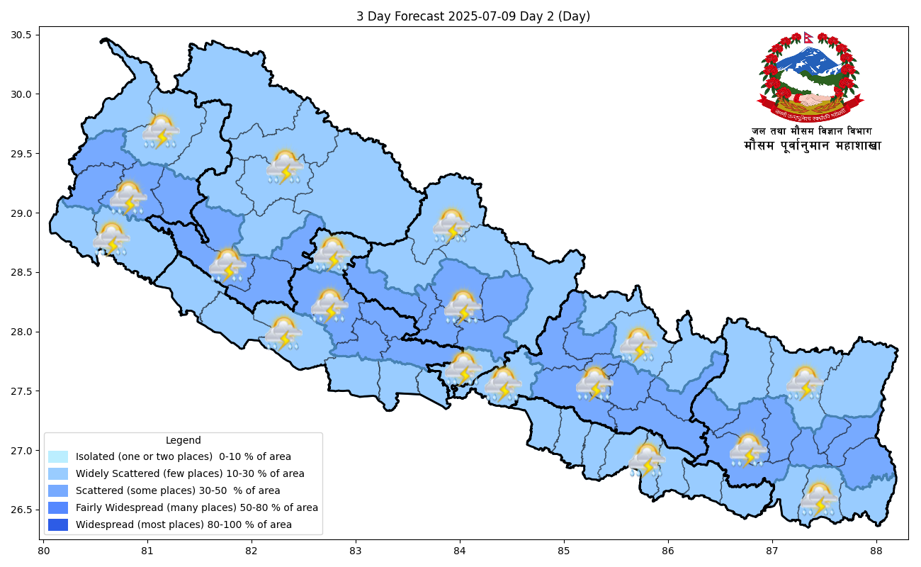 त्यसैगरी आज राति देशभर आंशिकदेखि साधारणतया बदली रहने छ । कोशी, गण्डकी, लुम्बिनी, कर्णाली र सुदूरपश्चिम प्रदेशका पहाडी भागका केही स्थान तथा अन्य प्रदेशका केही भागका मेघगर्जन र चट्याङसहित हल्कादेखि मध्यम वर्षाको सम्भावना छ । कोशी, गण्डकी, लुम्बिनी र सुदूरपश्चिम प्रदेशका एकदुई स्थानमा भारी वर्षाको सम्भावना छ । देशका उच्चपहाडी तथा हिमाली भागका केही स्थानमा हल्कादेखि मध्यम वर्षा र हिमपातको सम्भावना छ ।