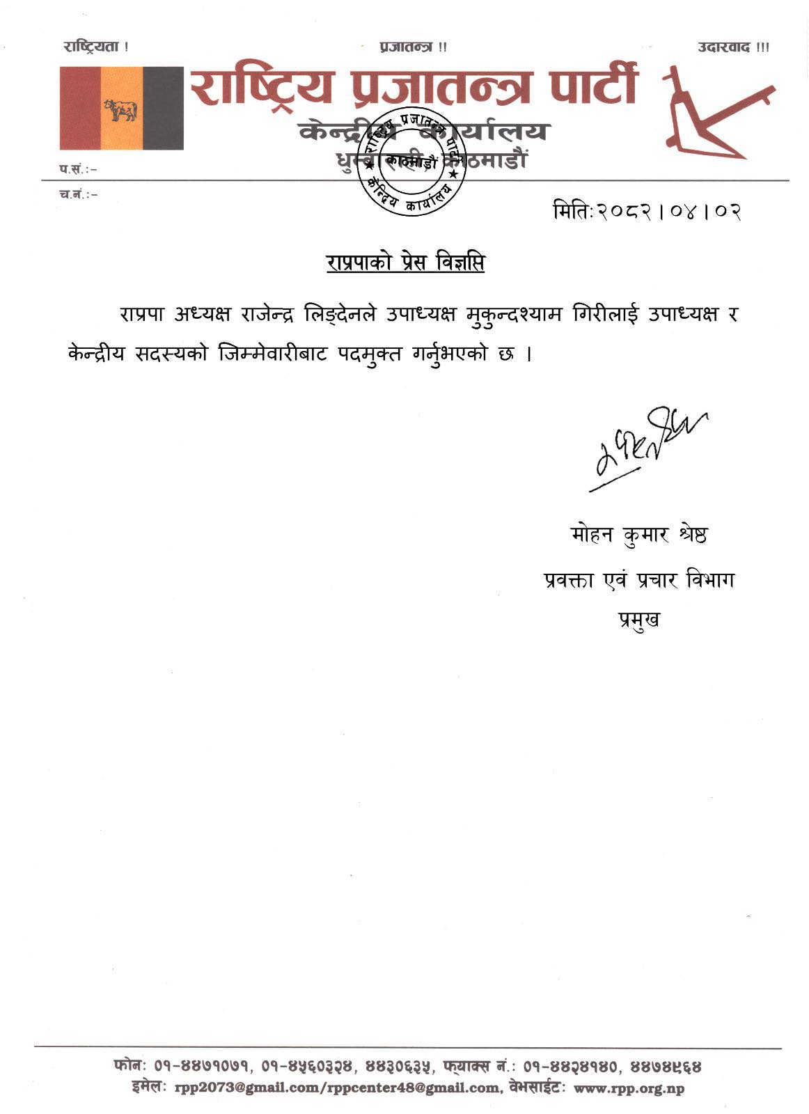 काठमाडौँ । राष्ट्रिय प्रजातन्त्र पार्टी (राप्रपा)ले पार्टीका उपाध्यक्ष मुकुन्दश्याम गिरीलाई पदमुक्त गरेको छ ।