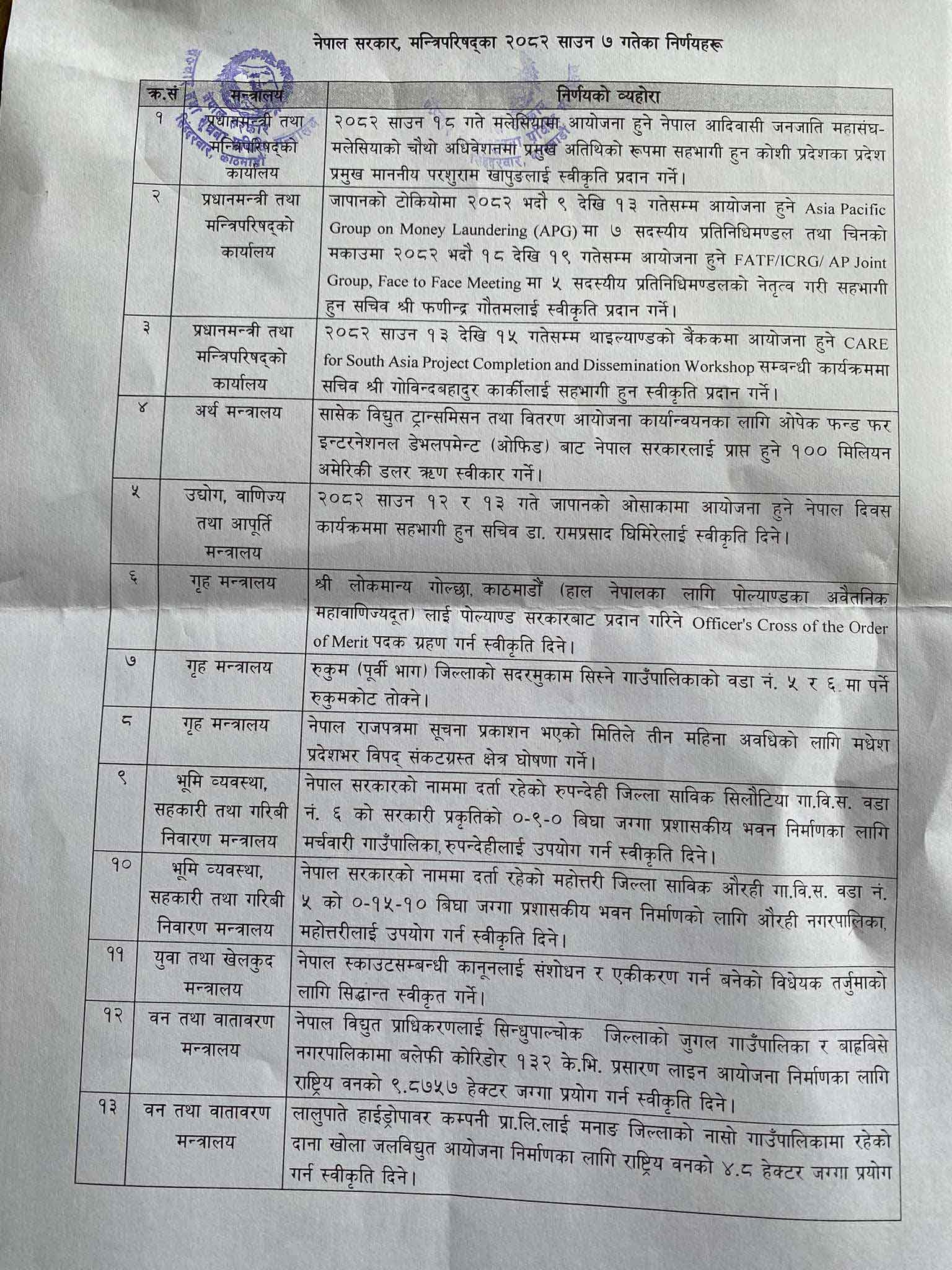 काठमाडौं । मन्त्रिपरिषद् बैठकका १३ वटा निर्णय सार्वजनिक भएका छन्।