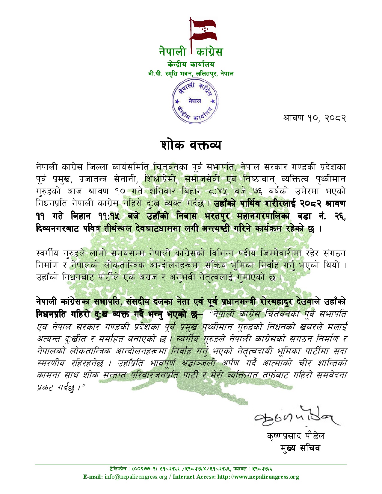काठमाडौँ । नेपाली कांग्रेस जिल्ला कार्यसमिति चितवनका पूर्व सभापति तथा नेपाल सरकार गण्डकी प्रदेशका पूर्व प्रमुख पृथ्वीमान गुरुङको निधनप्रति नेपाली कांग्रेसले शोक व्यक्त गरेको छ ।