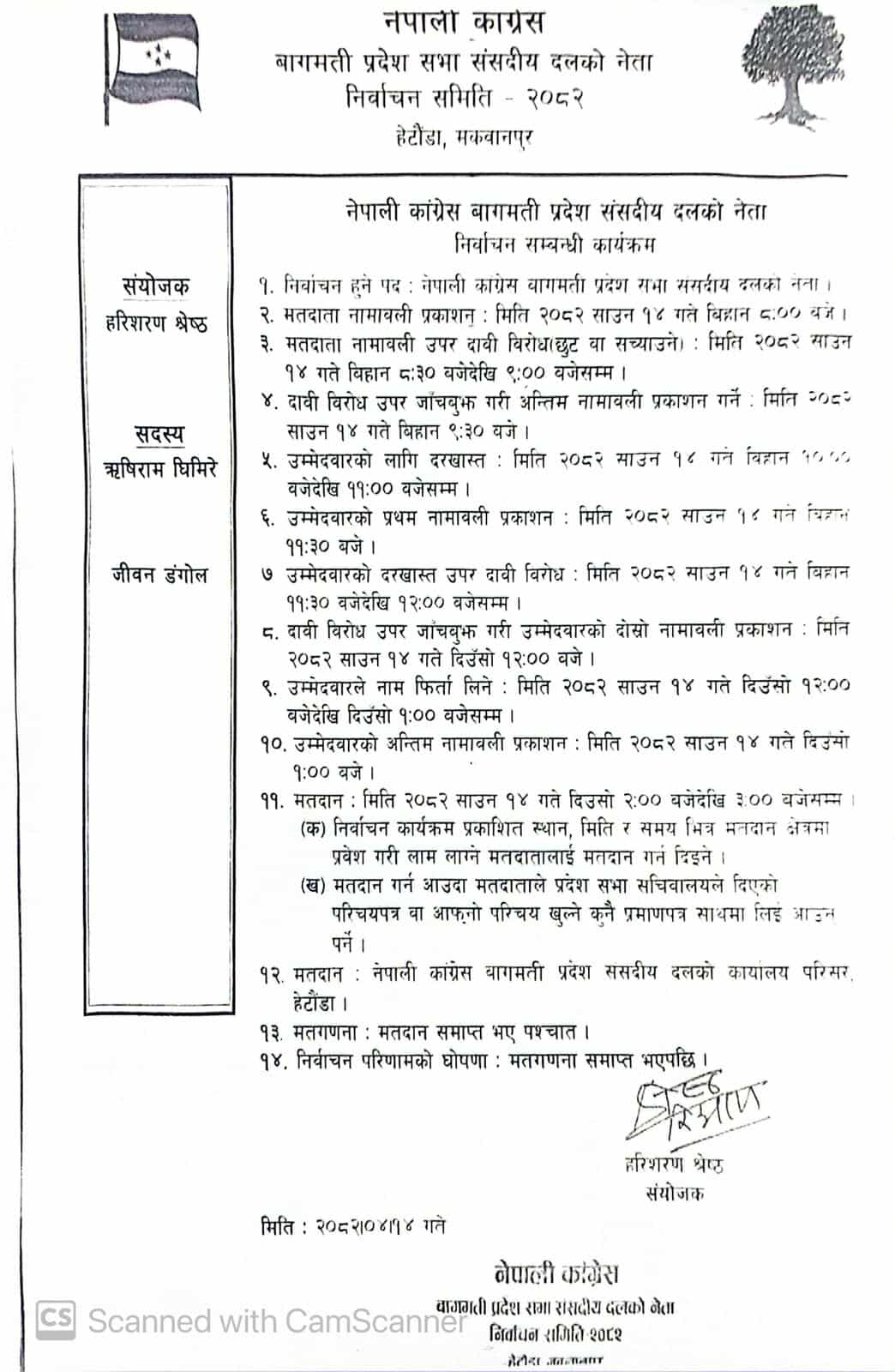 अन्तिम उम्मेदवारको नामावली दिउँसो १ बजे प्रकाशन गरिनेछ र मतदान आजै दिउँसो २ बजेदेखि ३ बजेसम्म हुनेछ। मतदान कांग्रेस बागमती प्रदेश संसदीय दलको कार्यालय, हेटौंडामा हुनेछ।