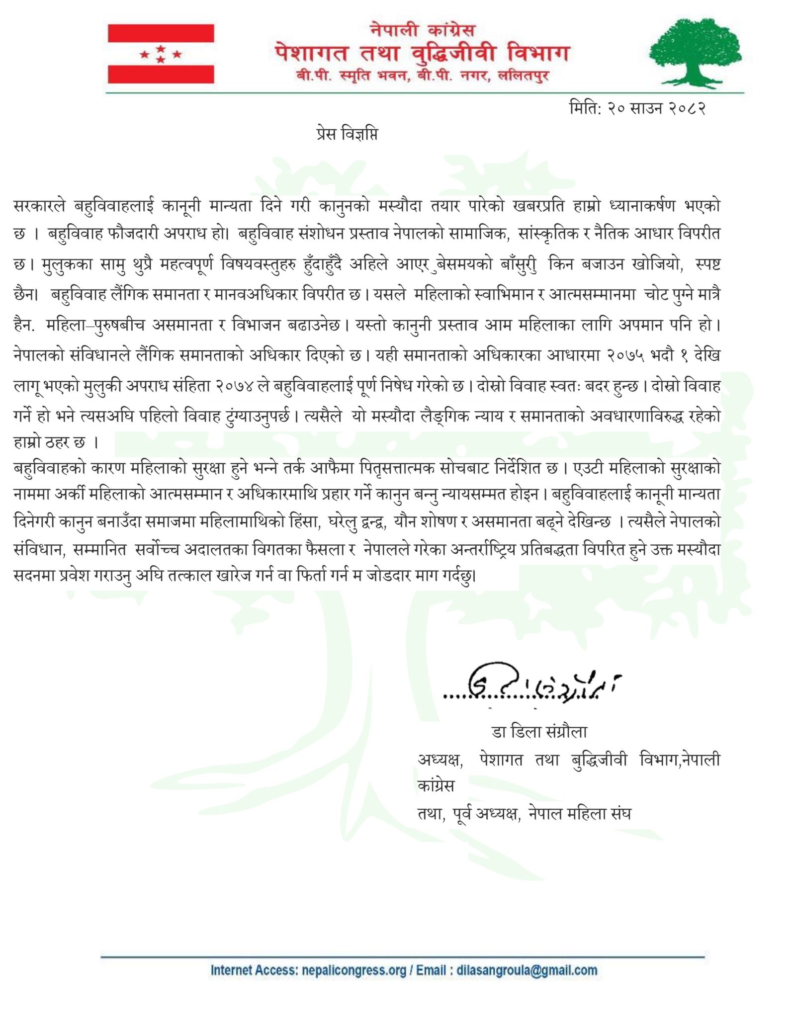 काठमाडौं। नेपाली कांग्रेसको केन्द्रीय सदस्य एवं पेशागत तथा वुद्धिजीवि विभाग प्रमुख डा. डिला संग्रौला पन्तले बहुविवाहलाई कानुनी मान्यता दिन नहुने बताएकी छन् । मंगलबार एक विज्ञप्ति जारी गर्दै उनले सरकारको प्रस्ताव प्रति आफ्नो गम्भीर ध्यानाकर्षण भएको बताएकी छन् । उनका अनुसार बहुविबाह फौजदारी अपराधका रुपमा रहेकाले यसलाई संशोधन गर्ने कुरा अस्वीकार्य छ ।