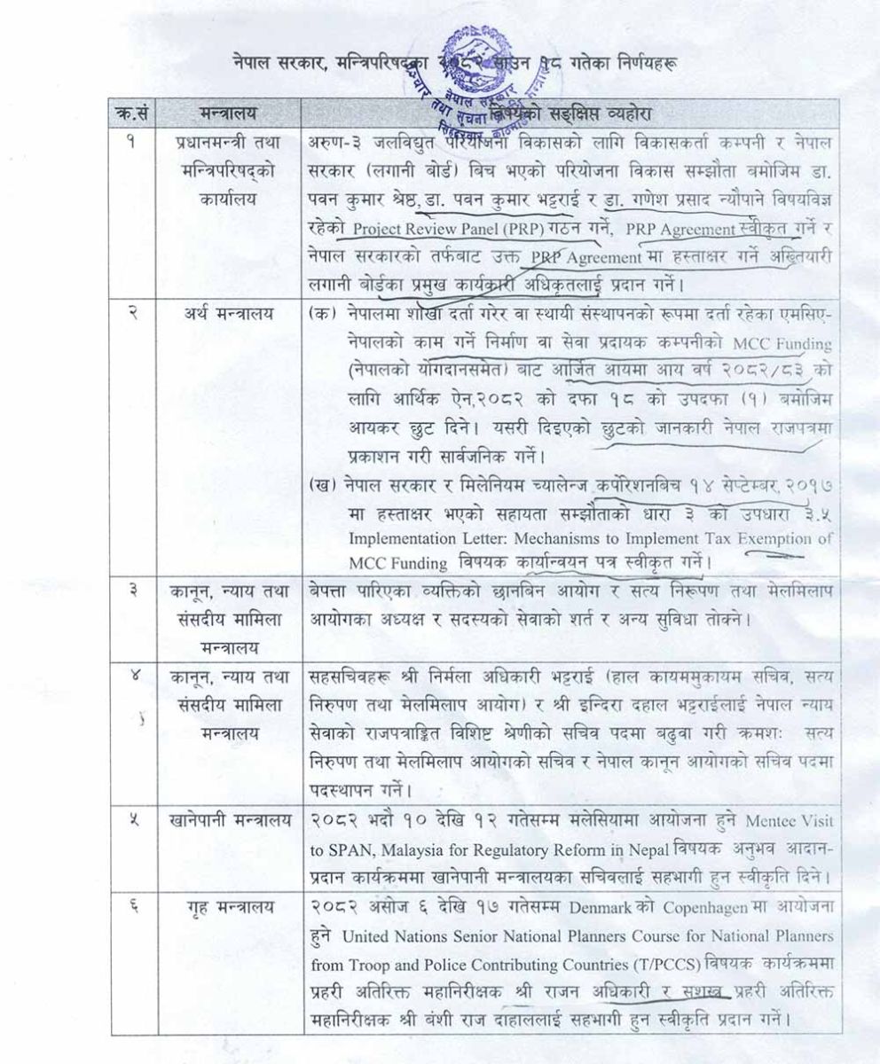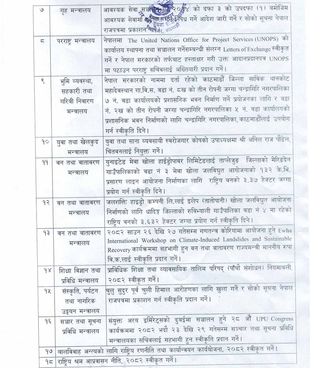 काठमाडौँ । साउन १८ गते बसेको मन्त्रिपरिषद्को बैठकका निर्णयहरु सार्बजनिक गरिएको छ ।