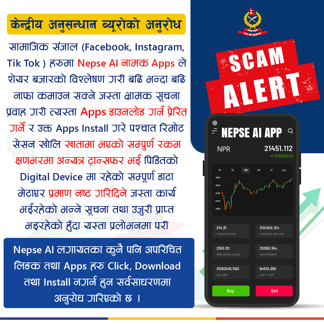 सो घटनाले सामाजिक सञ्जालमा आउने जुनसुकै लिङ्क खोल्न नहुने पनि सचेत गराएको छ । नेपाल प्रहरीका अनुसार पछिल्ला पटक धितोपत्र बजारको कारोबारका बारेमा जानकारी दिने नाममा ठगी गरिएको पाइएको छ ।