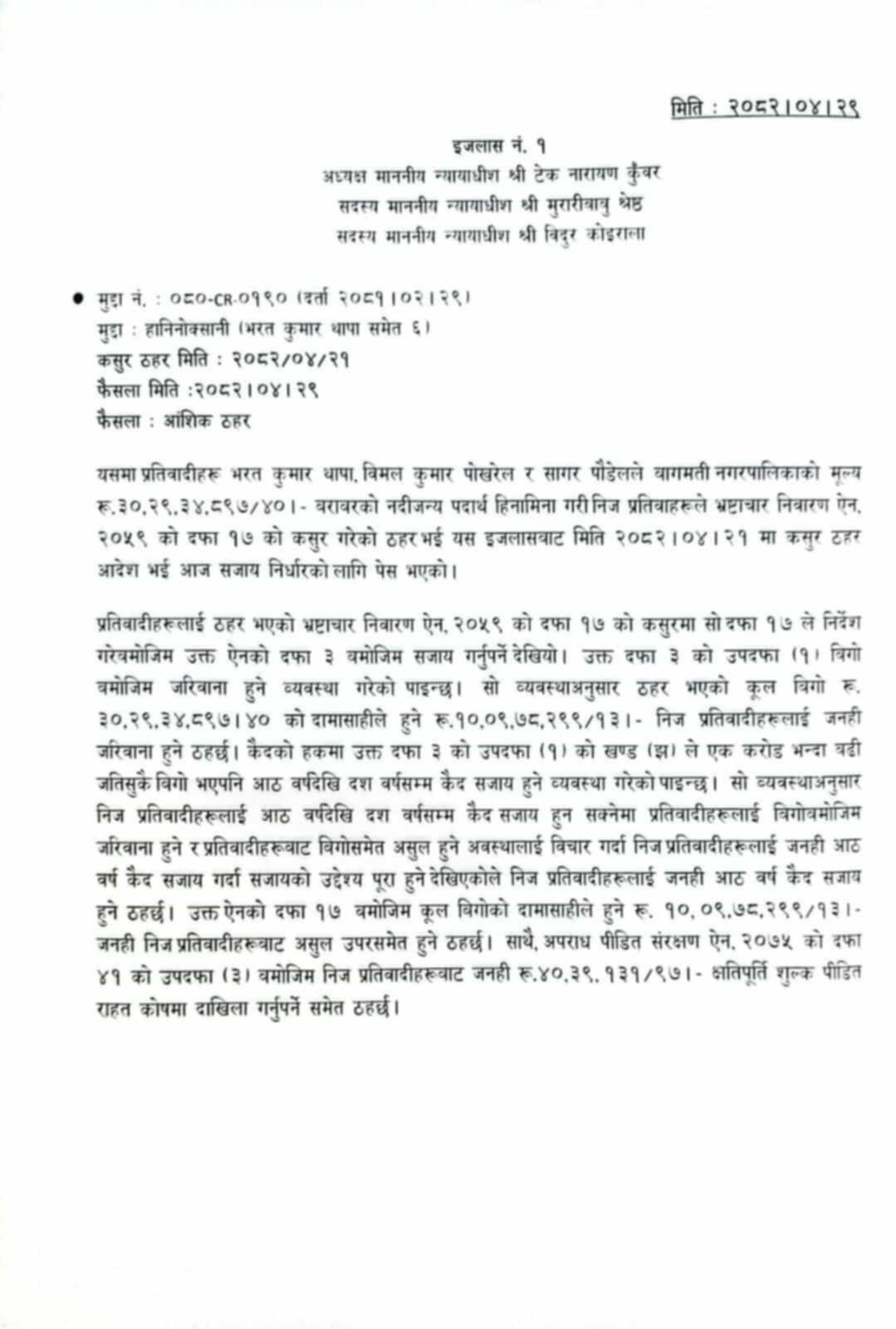 विशेष अदालतका अध्यक्ष न्यायाधीश टेकनारायण कुँवर, सदस्य न्यायाधीशद्वय मुरारीबाबु श्रेष्ठ र विदुर कोइरालाको इजलासले भ्रष्टाचार मुद्दामा मेयर थापा, अधिकृत विमलकुमार पोखरेल र योजना शाखा प्रमुख सागर पौडेललाई नदीजन्य पदार्थ हिनामिना गरी भ्रष्टाचार गरेको ठहर गरेको थियो । सो मुद्दामा आज सजाय सुनाइएको हो ।