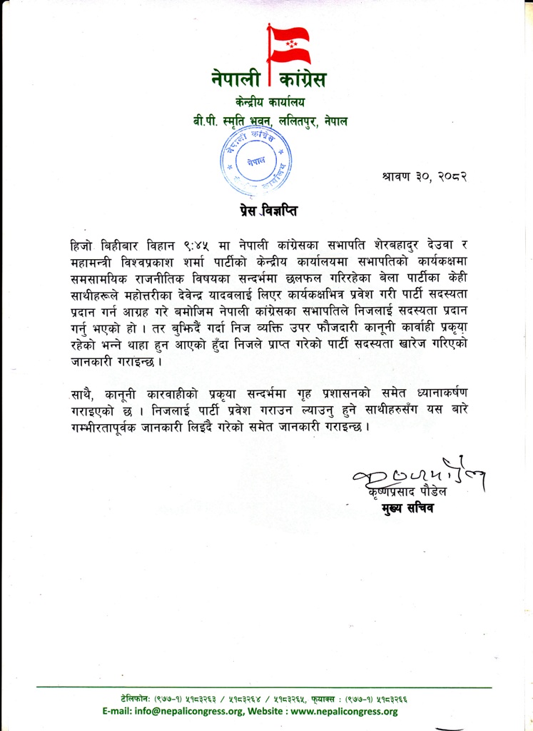 कांग्रेसका मुख्यसचिव कृष्णप्रसाद पौडेलद्वारा जारी विज्ञप्तिमा भनिएको छ, ‘निज व्यक्तिविरुद्ध फौजदारी कानुनी कारबाही प्रक्रिया रहेको जानकारीमा आएकाले कांग्रेसबाट दिइएको सदस्यता खारेज गरिएको छ। साथै कानुनी कारबाही प्रक्रिया अघि बढाउन गृह प्रशासनको ध्यानाकर्षण गराइएको छ।’